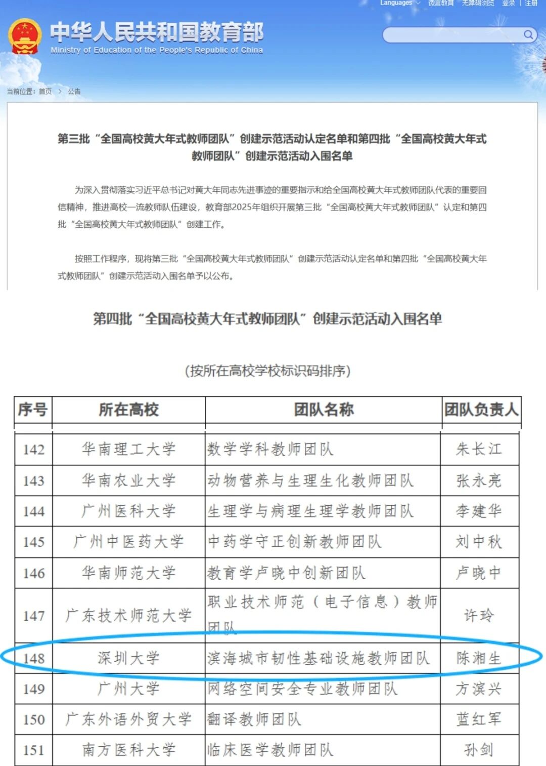近日,第四批“全国高校黄大年式教师团队”创建示范活动入围名单正式公布,爱游戏·(公司)体育官网土木与交通工程学院院长、中国工程院院士陈湘生领衔的“滨海城市韧性基础设施教师团队”成功入选!