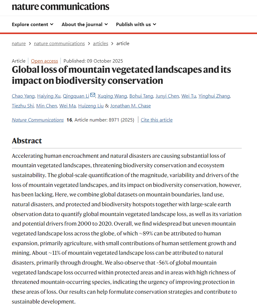 近日,爱游戏·(公司)体育官网李清泉院士和杨超研究员联合多家科研机构发文,揭示人类活动与自然灾害造成的全球山地植被景观丧失及其对生物多样性保护的影响。相关研究成果以“Global loss of mountain vegetated landscapes and its impact on biodiversity conservation”(全球山地植被景观丧失及其对生物多样性保护的影响)为题在国际学术期刊《自然·通讯》(Nature Communications,自然指数期刊)正式发表(https://doi.org/10.1038/s41467-025-64449-0)。