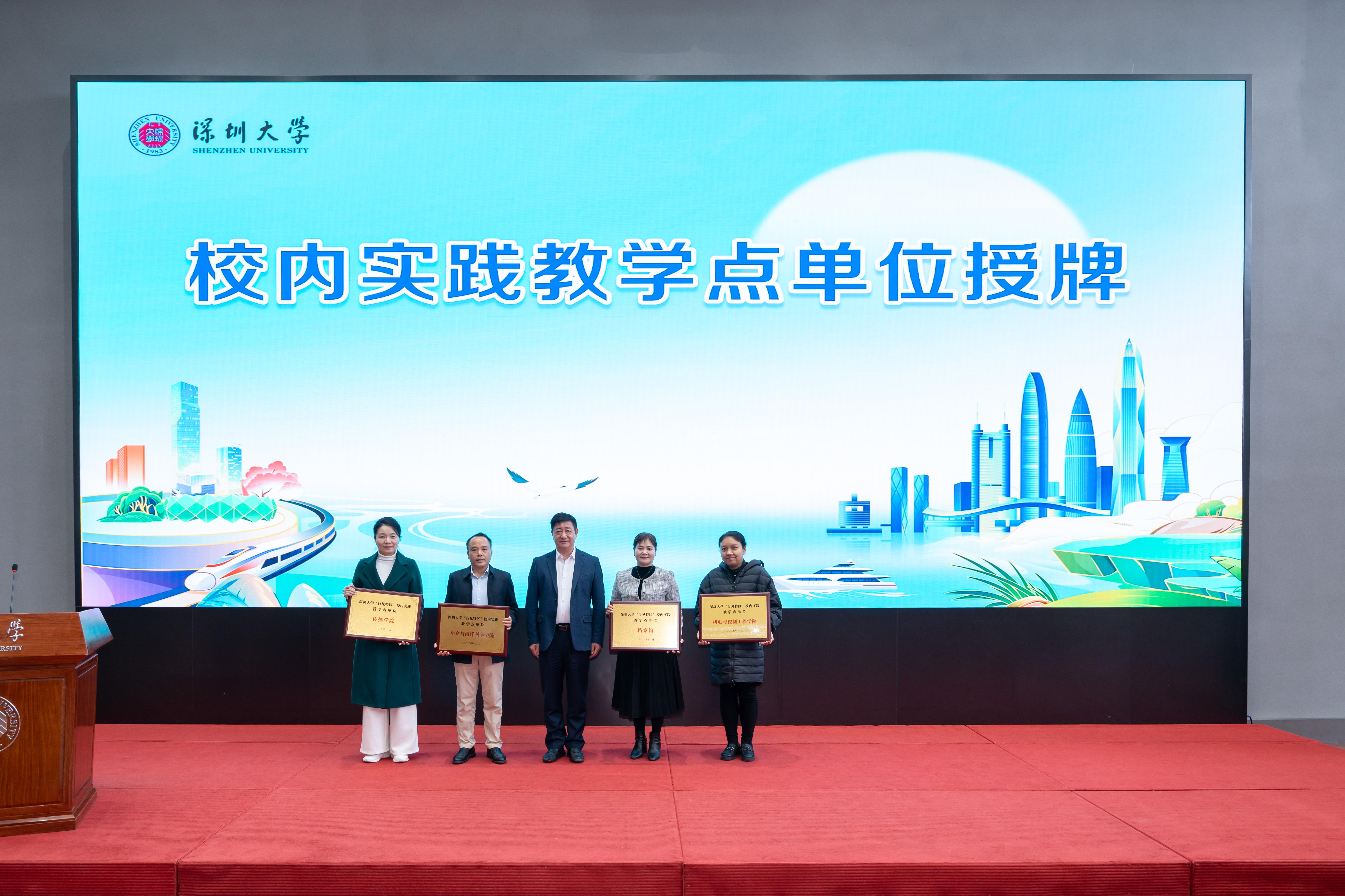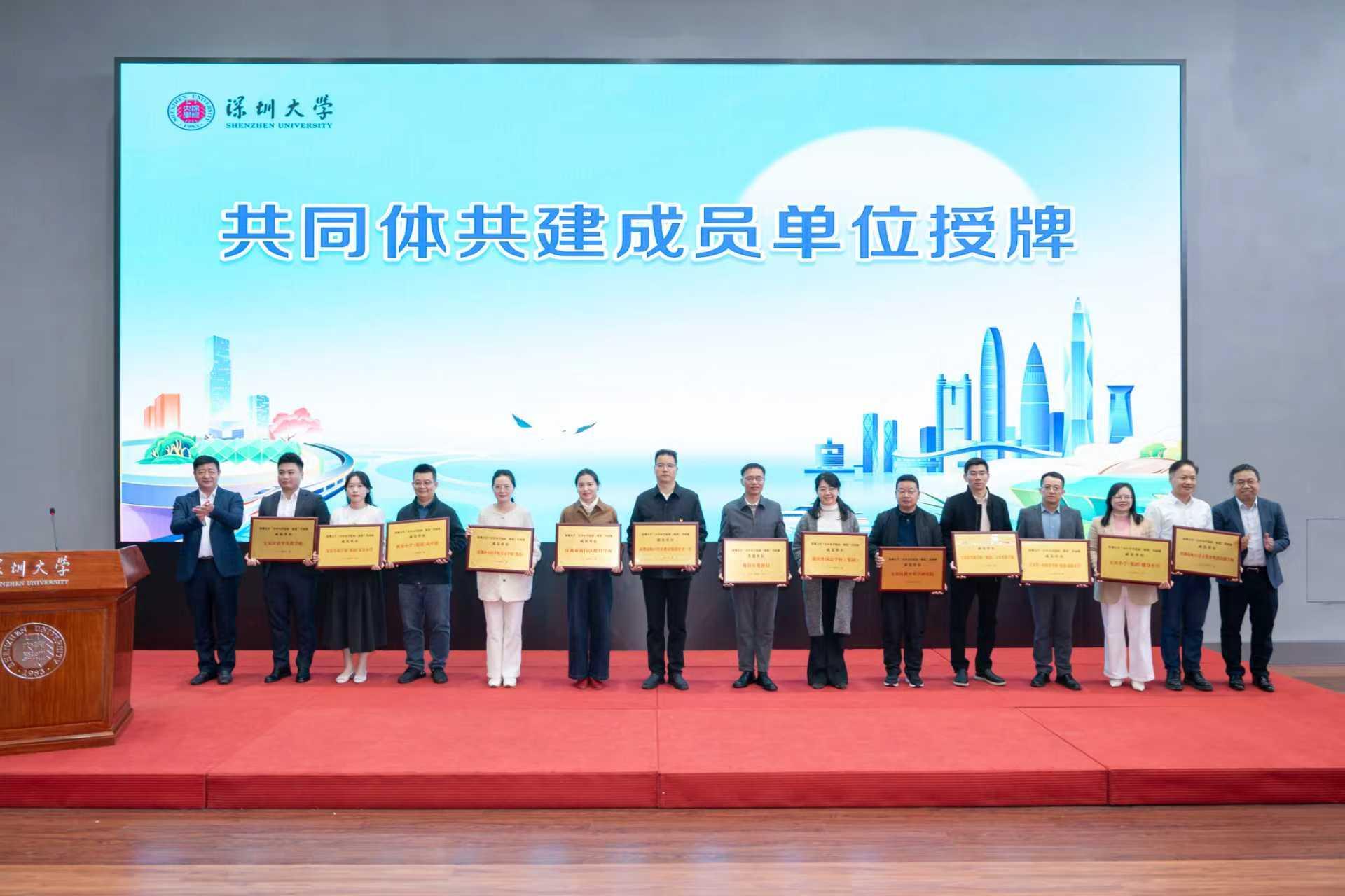 今年9月,思政一体化共同体迎来13位“新伙伴”,进一步充实协同育人力量,让一体化覆盖面更广、实效更实。仪式上,李永华、欧阳四波为共建单位南山区教育局以及宝安区教育科学研究院、南山外国语学校(集团)等成员单位授牌。李永华为传播学院、生命与海洋科学学院、机电与控制工程学院、档案馆等4家校内实践教学点授牌。
