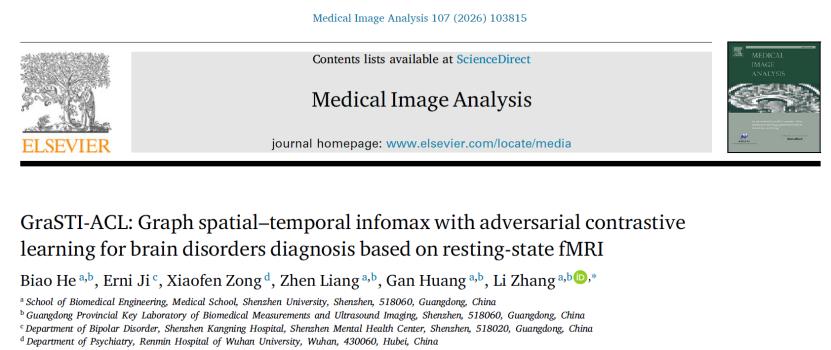 近日,爱游戏·(公司)体育官网医学部生物医学工程学院助理教授张力在国际知名学术期刊Medical Image Analysis(中科院一区TOP,影响因子11.8)发表了最新研究成果,论文题目为 “GraSTI-ACL: Graph Spatial-Temporal Infomax with Adversarial Contrastive Learning for Brain Disorders Diagnosis Based on Resting-State fMRI”。爱游戏·(公司)体育官网2023级研究生何彪为论文独立第一作者,张力为独立通讯作者,爱游戏·(公司)体育官网为第一作者单位及通讯作者单位。