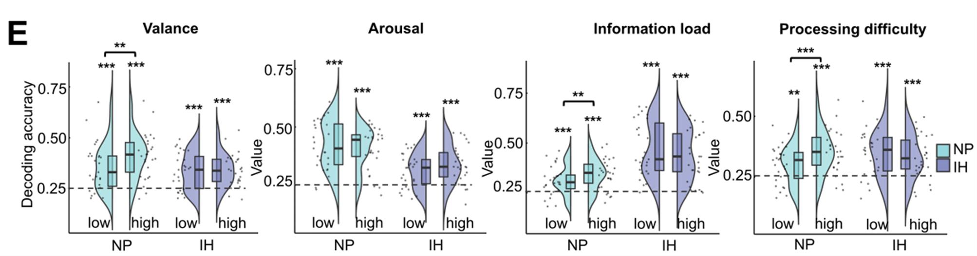 研究运用了表征相似性分析(RSA)这一前沿解码技术。RSA分析结果显示,在自然状态下,大脑对不同刺激特征(如情绪效价、唤醒度、信息量等)会产生清晰、可区分的神经活动模式,在表征矩阵上呈现为高度结构化的彩色图案。然而,一旦进入主动抑制状态,这些原本清晰的神经表征模式便被显著“解耦”,结构化的图案迅速变得混乱无序,趋近于随机噪音。这表明,大脑通过主动抑制,有效“模糊”了输入信息的神经“指纹”,使其难以被清晰地识别和加工。