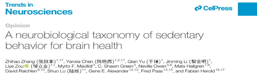 Zhang, Z., Chen, Y., Yu, Q., Li, J., Zou, L., Mavilidi, M. F., Green, C. S., Owen, N., Hallgren, M., Raichlen, D., Lu, S., Alexander, G. E., Paas, F., & Herold, F. (2025). A neurobiological taxonomy of sedentary behavior for brain health. Trends in neurosciences, S0166-2236(25)00188-2. https://doi.org/10.1016/j.tins.2025.09.002